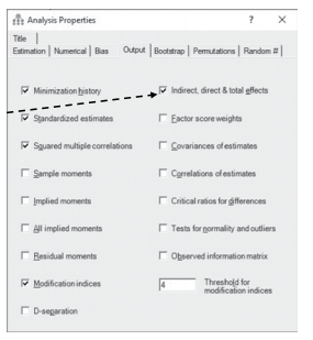 , and when the Analysis Properties pop-up window appears, go to the Out- put tab at the top. On that tab, you will see at the top right an option for “Indi- rect, direct, and total effects”. Select this option.