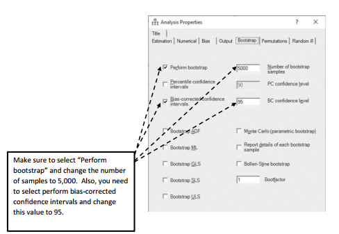Next, we need to request a boot- strap analysis in AMOS. To do this, go to the bootstrap tab at the top of the Analysis Properties window. On that tab will be a checkbox called “Perform bootstrap”; click that box. AMOS will initially give you a default number of 200 samples. This is way too small. Change the number of samples to 5,000. You will also need to select the “Bias-corrected confidence intervals” checkbox. AMOS will default a 90% confidence interval, but significance in most research is at the .05 level, so you need to change this to a 95% confidence level. I typically leave all the other options on this page blank. See Figure 6.3. After selecting the option of indirect effects in the output and asking AMOS to perform a bootstrap, you can cancel out of the Analysis Properties window and then run the analysis.