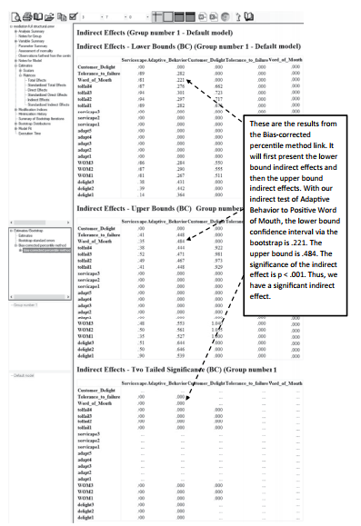To determine if the indirect effect of Adaptive Behavior to Positive Word of Mouth is significant, we need to request from AMOS the indirect, direct, and total effects in the output.This will give all pos- sible indirect effects in the model. To do this, select the Analysis Properties button