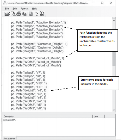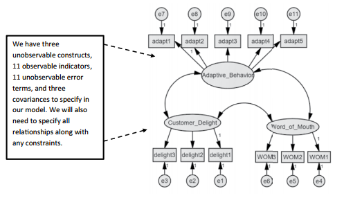 The unobserved Adaptive Behavior construct has a reflective path to its indicator of adapt1 and the path is constrained to 1. If we had no constraint in the path, then we would not include any value at the end of the line function. For instance, the next indicator to be coded for Adaptive Behavior would be: pd. Path (“adapt2”, “Adaptive_ Behavior”). You will need to code the relationship for each unobservable construct to its indicators. Make sure to code the constraint in each construct for the indicator that sets the metric.