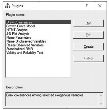 There are some advantages to using this function as well. While I do not prefer to code a whole model in this function, if you have a repetitive construct that you use continually, you can code the construct, its indicators, and error terms in the plugin for future use. For instance, if you consistently use an “Involvement” scale that was 13 items in the data set, you could code the unobservables and observables of the involvement construct and save it to the Plugins folder. When you were ready to include that construct in your model, you could use the plugin and save some time from creating a new 13-indicator construct every time. Addi- tionally, if a construct-to-construct relationship is consistently being modeled, this Plugins function will save you some effort instead of creating the constructs in the model every time. You do need to make sure to call the specific observables the same name across your data sets if you use the Plugins function for this, or AMOS will not be able to anlayze the data because of the different observable’s names listed in the data and in the model. The biggest advantage to coding the data this way is the flexibility it gives you in the analysis.You can code the unob- servables and observables in the model along with relationships but can still use the analysis icons to select options and text viewing in an easy manner compared to coding all the requests in the program editor. It is kind of like the best of both worlds. You can use syntax code to conceptualize the model and then use the icon functions to denote options in the analysis. For functions like two group analysis and invariance testing, this option is substantially easier than the alternative of coding every analysis option needed in the program editor software.