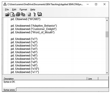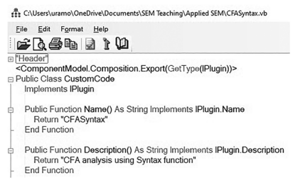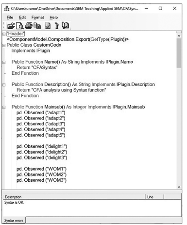 Before examining how to use the dedicated program editor software, I want to give you one more example of plugin coding for a full structural model. In our example, we just examined the measurement model, but this time let’s examine a full structural model where the meas- urement and the structural relationships are included.