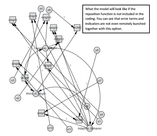 I know that after looking at the model drawn by AMOS, many of you are thinking “Wow, this is a hot mess! I thought the reposition function we added was going to group the denoted objects around an unobservable construct”.You are correct, the reposition function helps AMOS organize the model; this is the best AMOS can do without you specifically noting where you want each construct based on a pixel location, which is a very laborious process. Figure 10.60 shows you what the model looks like when the reposition function is not included in the coding.