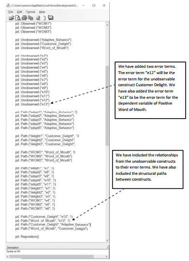 I am going to call this plugin “StructuralTest”, and it will include a simple description of a “full structural model test of Adaptive Behavior, Customer Delight, and Positive Word of Mouth”. This model test will examine how Adaptive Behavior influences Customer Delight which influences Positive Word of Mouth.The initial coding of unobservables and observables will be exactly the same, but we are going to add error terms to the dependent variables and relationships between the constructs. We will also remove all the covariances between the constructs because now we only have one independent construct. See Figure 10.61 for the coding of the structural model test.