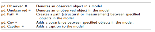 After telling AMOS what the unobservable and observable items are in the model, you can then add single headed or double headed arrow relationships in the model.You can also start to code any constraints that are in the model. Let’s start with adding the single headed arrow relationships in the CFA.We are going to use the “pd. Path” function next.When using the path function, you have to denote where the arrow is pointing to and where it is pointing from in the code.You also have to denote if the relationship has a constraint. Here is how the function is set up: