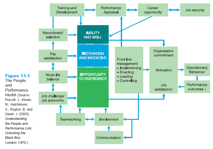 If we accept that there is sufficient evidence to claim that HR policies and practices do affect company performance (although some studies, for example Lahteenmaki and Storey 1998 do not support this) then we need to understand better the processes which link these HR practices to business performance. As Purcell et al. (2000) point out, ‘what remains unclear is what is actually happening in successful organisations to make this connection’ (p. 30). Job satisfaction was for a long time seen as key and some evidence was produced to support this (see, for example, Patterson et al. 1997). However, more generally, connections between this and organisational performance did not prove fruitful and the focus moved to commitment (Guest 2002) in mediating the impact of HR policies and practices on business performance. In addition to commitment researchers have also identified motivation as the mediating mechanism and some identify trust and morale. Purcell and his colleagues (2003) give equal prominence to job satisfaction and motivation and commitment. In their model HR policies and practices are seen to impact on employee ability/ skills, motivation and incentive (in that people can be motivated to use their ability productively via intrinsic and extrinsic rewards) and opportunity. In turn these three factors have an impact on commitment, individual motivation and job satisfaction, all of which have an impact on employee discretionary behaviour which in turn impacts on performance. Their ‘People and Performance’ model is displayed in Figure 11.1.