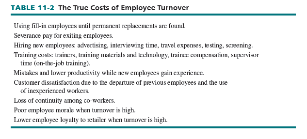 Retailing in the United States employs 25 million people. Thus, there is a constant need to attract new employees—and retain existing ones. For example, as many as 2 million fast-food workers are aged 16 to 20, and they stay in their jobs for short periods. In general, retailers need to reduce the turnover rate; when workers quickly exit a firm, the results can be disastrous. See Table 11-2. Turnover in retail averages around 66 percent for part-time hourly, whereas it drops to 27 percent for full-time employees with benefits such as health insurance.3
