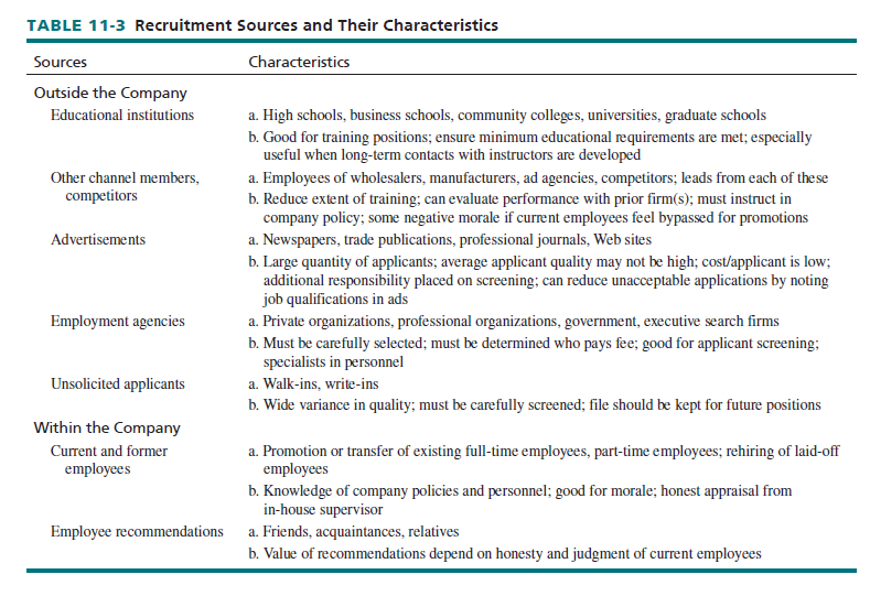 RECRUITING RETAIL PERSONNEL Recruitment is the activity whereby a retailer generates a list of job applicants. Table 11-3 indicates the features of several key recruitment sources. In addition to these sources, the Web now plays a bigger role in recruitment. Many retailers have a career or job section at their Web site, and some sections are as elaborate as the overall sites. Visit Target’s Web site (www.target.com), for example. Scroll down to the bottom of the home page and click on “more” and then “careers.”