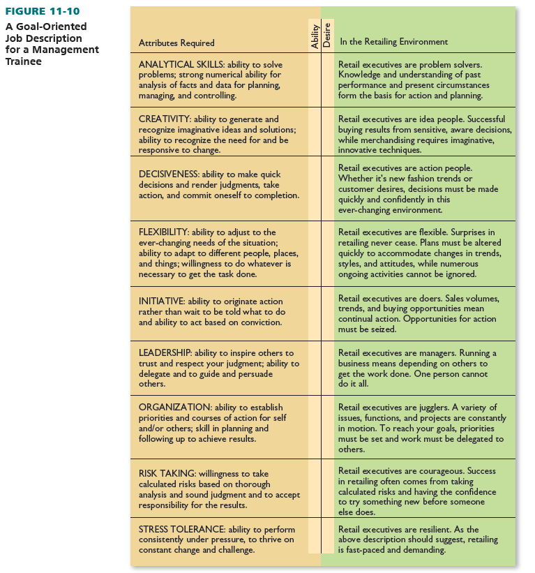 In job analysis, information is amassed on each job’s functions and requirements: duties, responsibilities, aptitude, interest, education, experience, and physical tasks. It is used to select personnel, set performance standards, and assign salaries. Thus, department managers often act as the main sales associates for their areas, oversee other sales associates, have some administrative duties, report to the store manager, are eligible for bonuses, and receive $25,000 to $45,000+ annually.