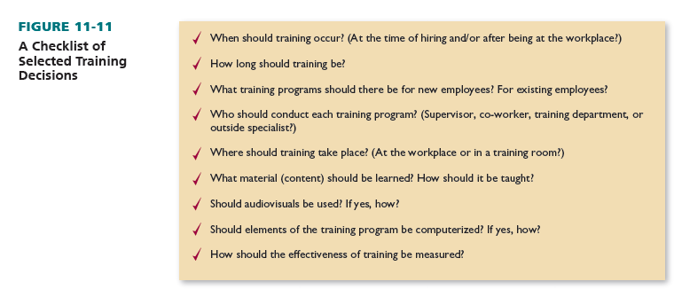 There are several training decisions, as shown in Figure 11-11. They can be divided into three categories: identifying needs, devising appropriate training methods, and evaluation.