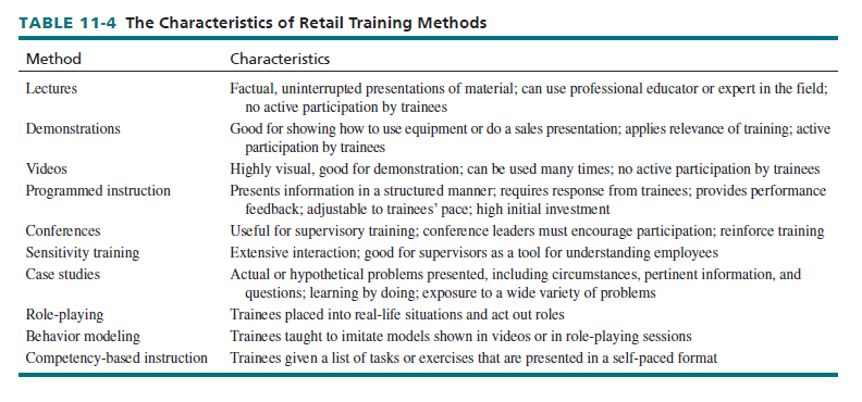 There are many training methods for retailers: lectures, demonstrations, videos, programmed instruction, conferences, sensitivity training, case studies, role-playing, behavior modeling, and competency-based instruction. Some techniques may be computerized, as evidenced by more and more firms.. The attributes of the various training methods are noted in Table 11-4. Retailers often use more than one technique to reduce employee boredom and to cover the material better.