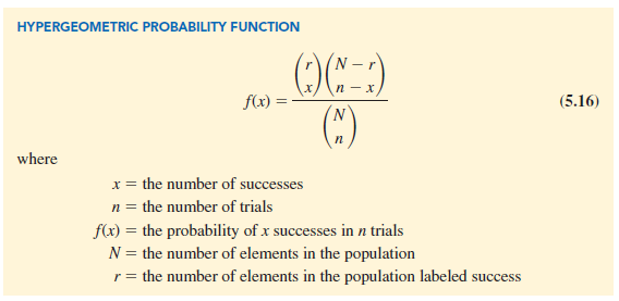 In the usual notation for the hypergeometric distribution, r denotes the number of elements in the population of size N labeled success, and N – r denotes the number of elements in the population labeled failure. The hypergeometric probability function is used to compute the probability that in a random selection of n elements, selected without replacement, we obtain x elements labeled success and n – x elements labeled failure. For this outcome to occur, we must obtain x successes from the r successes in the population and n – x failures from the N – r failures. The following hypergeometric probability function provides fx), the probability of obtaining x successes in n trials.