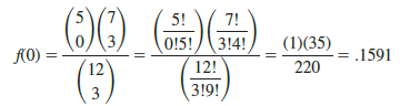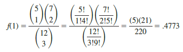 To illustrate the computations involved in using equation (5.16), let us consider the following quality control application. Electric fuses produced by Ontario Electric are packaged in boxes of 12 units each. Suppose an inspector randomly selects three of the 12 fuses in a box for testing. If the box contains exactly five defective fuses, what is the probability that the inspector will find exactly one of the three fuses defective? In this application, n = 3 and N = 12. With r = 5 defective fuses in the box the probability of finding x = 1 defective fuse is