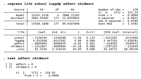 In addition to these standard F and t tests, Stata can perform F tests of user-specified hypotheses. The test command refers back to the most recently fitted model such as anova or regress. Returning to our four-predictor regression example, suppose we with to test the null hypothesis that both adfert and chldmort (considered jointly) have zero effect.