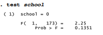 test also could duplicate the individual-coefficient tests. Regarding the coefficient on school, for example, the F statistic obtained by test equals the square of the t statistic in the regression table, 2.25 = (-1.50)2, and yields exactly the same p-value: