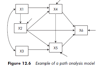 A model is said to be recursive if it has no bi-directional causal effect (that is, no causal relationship that is directly or indirectly reciprocal). While the terms can seem misleading, it should be noted that recursive models are unidirectional, and non-recursive models bi-directional. Recursive models occupy an important position in the history of causal models. One of the most well-known members of this family of methods, path analysis, uses only with recursive models. The other major characteristic of path analysis is that it only considers manifest variables. Path analysis is a case in point among causal models (Maruyama, 1998). Figure 12.6 presents an example of a path analysis model.