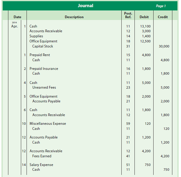 After analyzing each of Kelly Consulting’s transactions for April, the journal entries are recorded as shown in Exhibit 9.