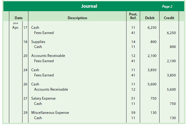 - Recorded services provided on account for the period April 13-20, $2,100.