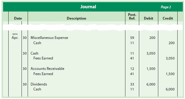 - Recorded cash from cash clients for fees earned for the period April 25-30, $3,050. 30. Recorded services provided on account for the remainder of April, $1,500.