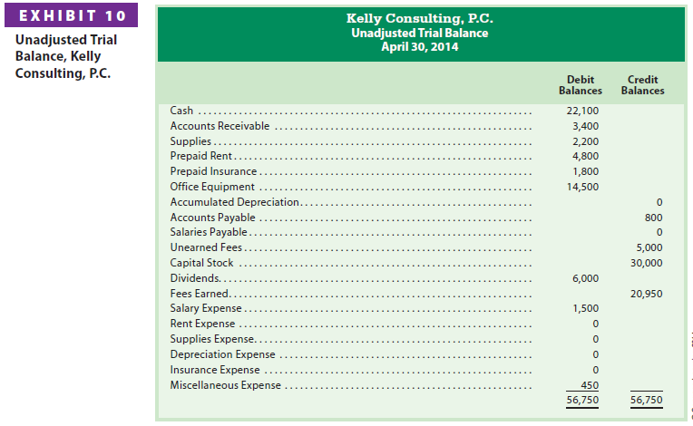 The unadjusted account balances shown in Exhibit 10 were taken from Kelly Consulting’s ledger shown in Exhibit 17, on pages 172-173, before any adjusting entries were recorded.
