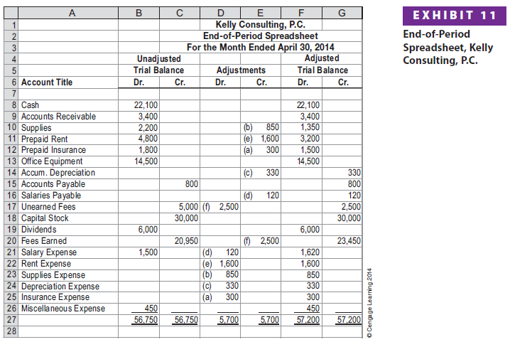 Although an end-of-period spreadsheet is not required, it is useful in showing the flow of accounting information from the unadjusted trial balance to the adjusted trial balance. In addition, an end-of-period spreadsheet is useful in analyzing the impact of proposed adjustments on the financial statements. The end-of-period spreadsheet for Kelly Consulting is shown in Exhibit 11.