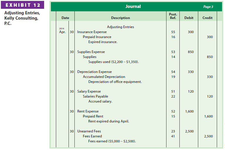 Based on the adjustment data shown in Step 4, adjusting entries for Kelly Consulting are prepared as shown in Exhibit 12. Each adjusting entry affects at least one income statement account and one balance sheet account. Explanations for each adjustment including any computations are normally included with each adjusting entry.