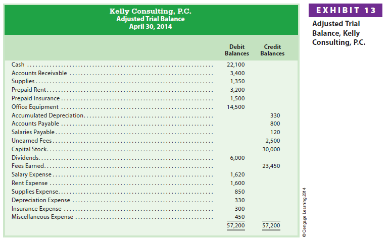 After the adjustments have been journalized and posted, an adjusted trial balance is prepared to verify the equality of the total of the debit and credit balances. This is the last step before preparing the financial statements. If the adjusted trial balance does not balance, an error has occurred and must be found and corrected. The adjusted trial balance for Kelly Consulting as of April 30, 2014, is shown in Exhibit 13.