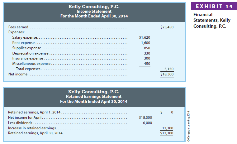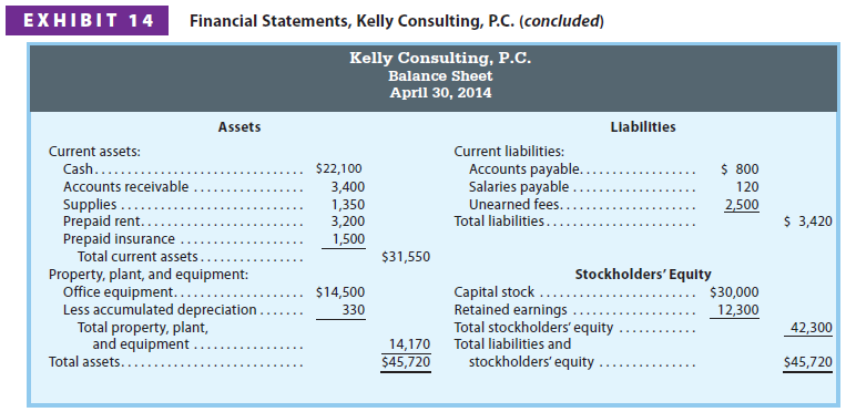The financial statements for Kelly Consulting are shown in Exhibit 14. Kelly Consulting earned net income of $18,300 for April. As of April 30, 2014, Kelly Consulting has total assets of $45,720, total liabilities of $3,420, and total stockholders’ equity of $42,300.