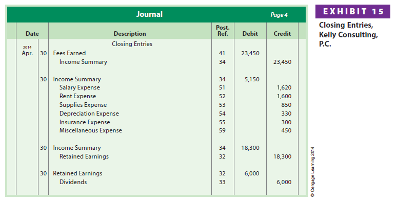 The four closing entries for Kelly Consulting are shown in Exhibit 15. The closing entries are posted to Kelly Consulting’s ledger as shown in Exhibit 17 (pages 172173). After the closing entries are posted, Kelly Consulting’s ledger has the following characteristics: