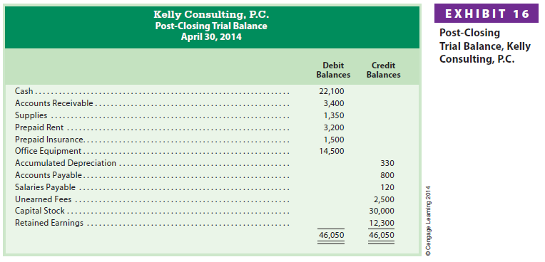 The post-closing trial balance for Kelly Consulting is shown in Exhibit 16. The balances shown in the post-closing trial balance are taken from the ending balances in the ledger shown in Exhibit 17. These balances agree with the amounts shown on Kelly Consulting’s balance sheet in Exhibit 14.