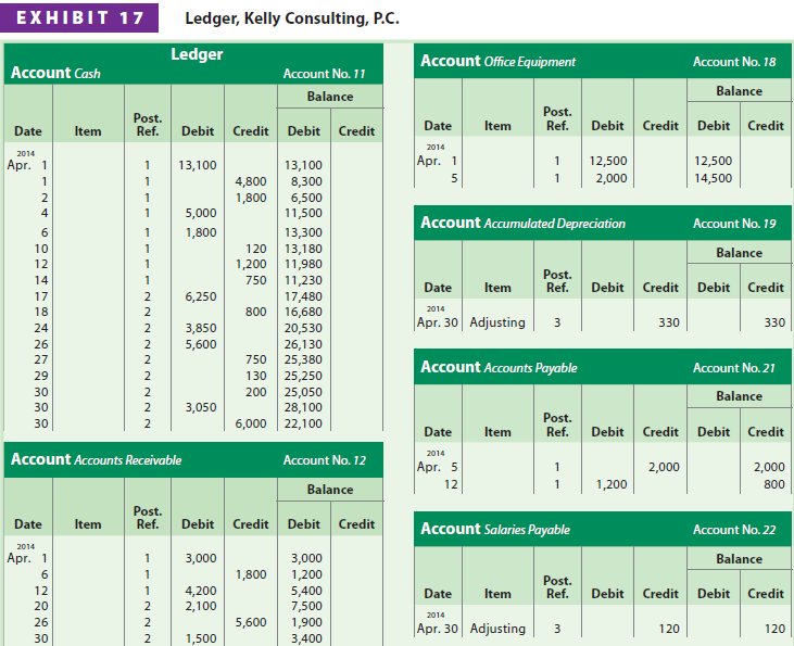 The journal entries for Kelly Consulting have been posted to the ledger shown in Exhibit 17 on pages 172-173.