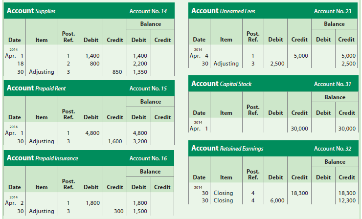 Before the financial statements can be prepared, the accounts must be updated. The four types of accounts that normally require adjustment include prepaid expenses, unearned revenue, accrued revenue, and accrued expenses. In addition, depreciation expense must be recorded for fixed assets other than land. The following data have been assembled on April 30, 2014, for analysis of possible adjustments for Kelly Consulting: