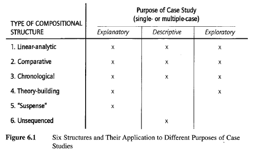 Alternatives also exist for structuring case study reports. This section suggests six illustrative structures (see Figure 6.1) that may be used with any type of case study formats just described. The illustrations are described mainly in relation to the composition of a single-case study, although the principles are readily translatable into multiple-case reports. As a further note and as indicated in Figure 6.1, the first three are all applicable to descriptive, exploratory, and explanatory case studies. The fourth is applicable mainly to exploratory and explanatory case studies, the fifth to explanatory cases, and the sixth to descriptive cases.