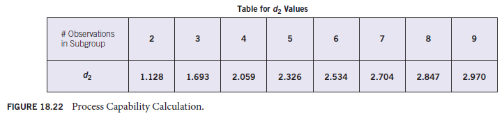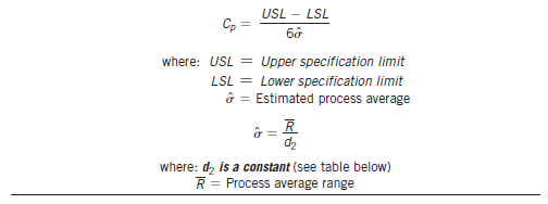 Two methods exist for determining process capability. The first assumes that the bell curve is centered on the specification average and is called Cp. The second does not assume alignment of the process average and the specification average and is called Cp^. Figure 18.22 explains the procedures for calculating these capability indices. As we have already learned, it is possible to have a process that is in control and still not capable of meeting the customer’s specifications. When this is the case, it is up to management to replace or upgrade the process capability, which may require the purchase of new equipment.
