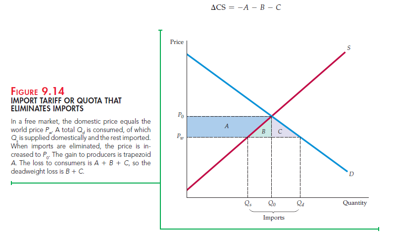 In Figure 9.15, this tariff leads to a change of consumer surplus given by