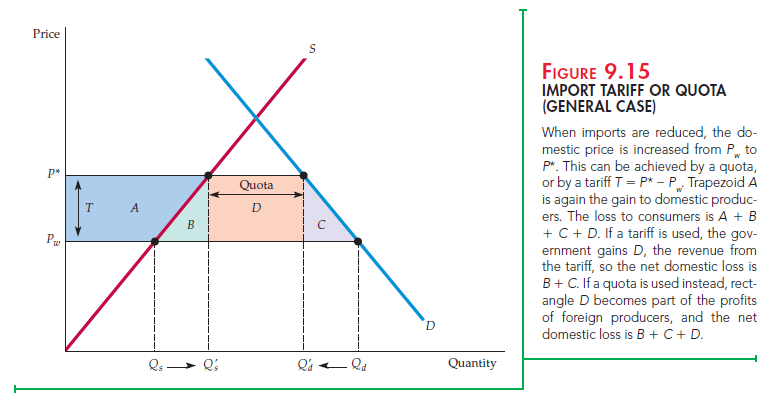 Finally, the government will collect revenue in the amount of the tariff times the quantity of imports, which is rectangle D. The total change in welfare, ACS plus A PS plus the revenue to the government, is therefore -A – B – C – D + A + D = -B – C. Triangles B and C again represent the deadweight loss from restricting Suppose the government uses a quota instead of a tariff to restrict imports: Foreign producers can only ship a specific quantity (Q’d − Q’s in Figure 9.15) to the United States and can then charge the higher price P* for their U.S. sales. The changes in U.S. consumer and producer surplus will be the same as with the tariff, but instead of the U.S. government collecting the revenue given by rectangle D, this money will go to the foreign producers in the form of higher profits. The United States as a whole will be even worse off than it was under the tariff, losing D as well as the deadweight loss B and C.12