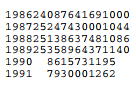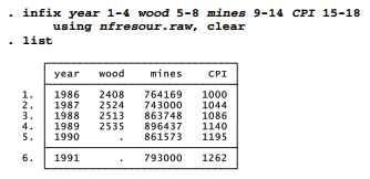 These data concern natural resource production in Newfoundland. The four variables occupy fixed column positions: columns 1-4 are the years (1986…1991); columns 5-8 measure forestry production in thousands of cubic meters (2408…missing); columns 9-14 measure mine production in thousands of dollars (764,169…793,000); and columns 15-18 are the consumer price index relative to 1986 (1000…1262). Notice that in fixed-column format, unlike whitespace or tab-delimited files, blanks indicate missing values, and the raw data contain no decimal points. To read nfresour.raw into Stata, we specify each variable’s column position: