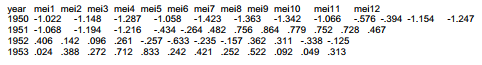 We can illustrate text file methods with another climate-themed time series. El Nino-Southern Oscillation (ENSO) is a quasi-periodic climate pattern centered in the tropical Pacific Ocean but affecting other regions as well. The Multivariate ENSO Index (MEI) combines six observed variables describing tropical Pacific conditions (sea-level pressure, zonal and meridional surface winds, sea surface and surface air temperature, and cloudiness) into a single indicator for ENSO. Text file MEI.raw contains monthly values of MEI from January 1950 through December 2011. These are tab-separated values, a common format for text files written by spreadsheets. The first row of the text file contains a list of variable names: meil for January MEI, mei2 for February, and so forth (actually the “January” MEI value represents December-January, and February represents January-February, etc.). The first few rows of the text file look like this: