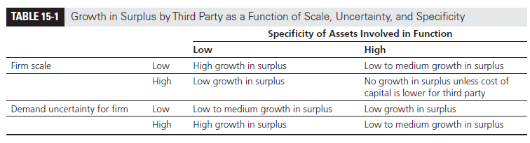 One instance in which a firm may outsource to a third party even when none of the mentioned factors suggests outsourcing is shortage of capital or a third party with a much lower cost of capital. In either of these scenarios, the third party can grow the surplus by bringing lower-cost capital to the supply chain. This discussion on how and when a third party can increase the supply chain surplus is summarized in Table 15-1.