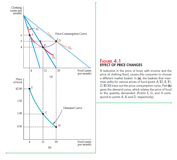 Now look at Figure 4.1 (b), which shows the relationship between the price of food and the quantity demanded. The horizontal axis measures the quantity of food consumed, as in Figure 4.1 (a), but the vertical axis now measures the price of food. Point G in Figure 4.1 (b) corresponds to point B in Figure 4.1 (a). At G, the price of food is $1, and the consumer purchases 12 units of food.