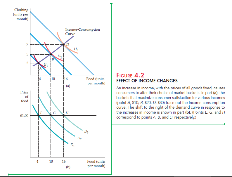 What happens if the consumer ’s income is increased to $20? Her budget line then shifts outward parallel to the original budget line, allowing her to attain the utility level associated with indifference curve U2. Her optimal consump- tion choice is now at B, where she buys 10 units of food and 5 units of clothing. In Figure 4.2 (b) her consumption of food is shown as G on demand curve D2. D2 is the demand curve that would be traced out if we held income fixed at $20 but varied the price of food. Finally, note that if her income increases to $30, she chooses D, with a market basket containing 16 units of food (and 7 units of clothing), represented by H in Figure 4.2 (b).