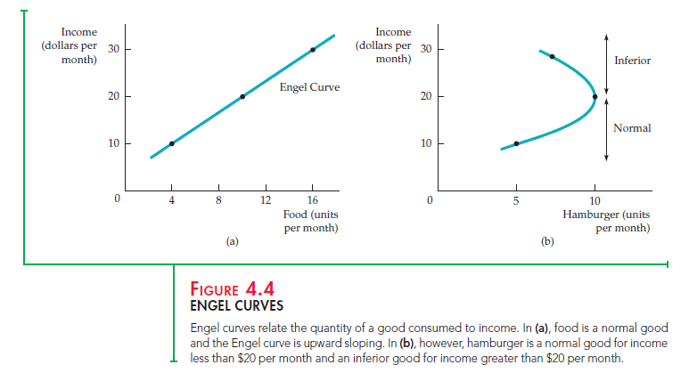 Figure 4.4 (b), derived from Figure 4.3, shows the Engel curve for hamburger. We see that hamburger consumption increases from 5 to 10 units as income increases from $10 to $20. As income increases further, from $20 to $30, con- sumption falls to 8 units. The portion of the Engel curve that slopes downward is the income range within which hamburger is an inferior good.