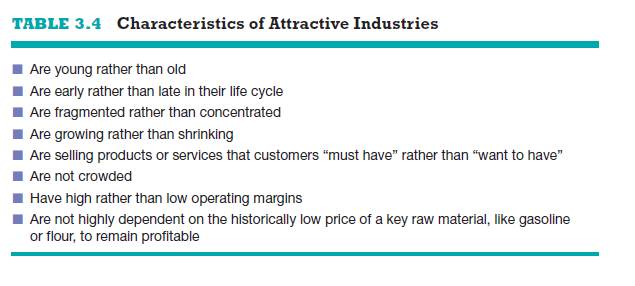 Industries vary in terms of their overall attractiveness.5 In general, the most at- tractive industries have the characteristics depicted in Table 3.4. The top three factors are particularly important. Industries that are young rather than old, are early rather than late in their life cycle, and are fragmented rather than con- centrated are more receptive to new entrants than industries with the opposite characteristics. You also want to pick an industry that is structurally attractive— meaning start-ups can enter the industry (in various target markets) and com- pete effectively. Some industries are characterized by such high barriers to entry or the presence of one or two dominant players that potential new entrants are essentially shut out.