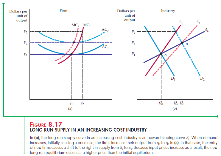 The new equilibrium at B in Figure 8.17 (b) is, therefore, on the long-run sup- ply curve for the industry. In an increasing-cost industry, the long-run industry supply curve is upward sloping. The industry produces more output, but only at the higher price needed to compensate for the increase in input costs. The term “increasing cost” refers to the upward shift in the firms’ long-run average cost curves, not to the positive slope of the cost curve itself.