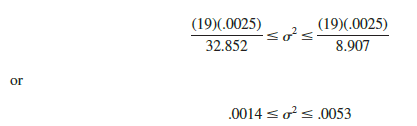 Let us return to the problem of providing an interval estimate for the population variance of filling quantities. Recall that the sample of 20 containers provided a sample variance of s2 = .0025. With a sample size of 20, we have 19 degrees of freedom. As shown in Figure 11.2, we have already determined that x2975 = 8.907 and x2025 = 32.852. Using these values in expression (11.6) provides the following interval estimate for the population variance.