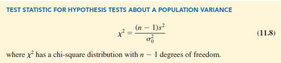 The procedure for conducting a hypothesis test about a population variance uses the hypothesized value for the population variance sO and the sample variance s2 to compute the value of a X2 test statistic. Assuming that the population has a normal distribution, the test statistic is as follows: