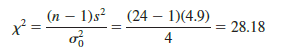 Suppose that a random sample of 24 bus arrivals taken at a downtown intersection provides a sample variance of s2 = 4.9. Assuming that the population distribution of arrival times is approximately normal, the value of the test statistic is as follows.