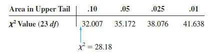Like the t distribution table, the chi-square distribution table does not contain sufficient detail to enable us to determine the p-value exactly. However, we can use the chi-square distribution table to obtain a range for the p-value. For example, using Table 11.1, we find the following information for a chi-square distribution with 23 degrees of freedom.