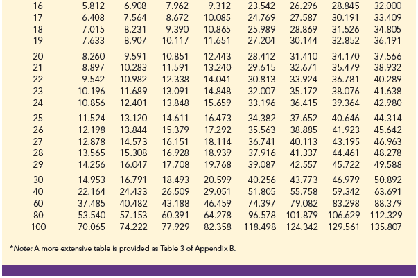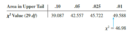 Now, let us compute the p-value. Using Table 11.1 and n – 1 = 30 – 1 = 29 degrees of freedom, we find the following.