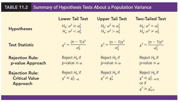 Thus, the value of the test statistic x2 = 46.98 provides an area between .025 and .01 in the upper tail of the chi-square distribution. Doubling these values shows that the two-tailed p-value is between .05 and .02. Statistical software can be used to show the exact p-value = .0374. With p-value < a = .05, we reject H0 and conclude that the new examination test scores have a population variance different from the historical variance of σ2 = 100. A summary of the hypothesis testing procedures for a population variance is shown in Table 11.2.